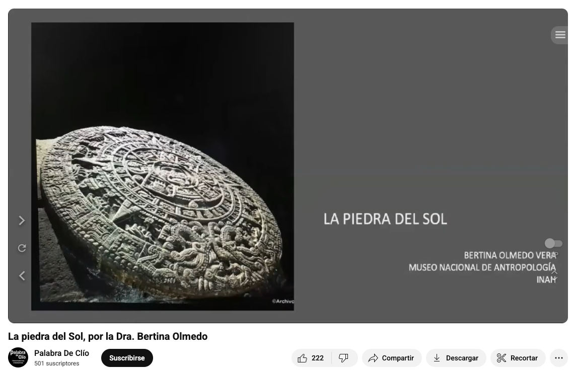 Palabra de Clío nos presenta este video que nos muestra una exposición de la Dra. Bertina Olmedo Vera, ella es curadora de la Sala Mexica en el Museo Nacional de Antropología. Yo considero que se debe destacar la asociación que la profesora hace de la Xiucóatl (el último anillo, el extremo), y las estrellas Pléyades. La imagen tiene link a YouTube.